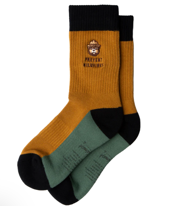 Take the step to join Smokey Bear in his crucial mission to Prevent Wildfires. These socks boast a vintage knit-in design of Smokey's recognizable face. Wear them as a reminder of the responsibility we all share in protecting our forests.